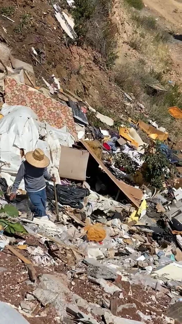 Today was a busy day, a “positive day,” which doesn’t mean that it was an easy-going and friendly day. A “positive day” means that we found one dead body and possibly more. We went back to the previous site, El Morro, near Rosarito, 45 miles from Tijuana City. Before going to El Morro (a cliff used as a garbage dump) we stopped at two sites nearby. At the first site, we were looking for a young man in his 20s. He disappeared five days ago, and his family was with us. We searched in the same formation — a straight line walking together in a flat grassy area. A surveillance drone was used and a search dog. Unfortunately for the family, we didn’t find anything. We then drove five minutes up the hill to a garbage center. They didn’t allow allow us to go in, but we searched the surroundings outside of the garbage center. There was a fire burning inside the center, and all the fumes were blowing our way, but that didn’t stop us from searching. While we were searching, we received a message on the radio that somebody had found a body close by, so we drove there. At the scene there was an area where it seemed that the soil had been removed recently. It smelled strong, and somebody started removing some soil with a shovel. I saw worms and bugs and some blood there. Everybody started saying. “yeah there is somebody there.” The family that was looking for their son was there, and they asked us to start digging out the body. The crime scene team arrived, and they decided to take over the digging. A few minutes later they announced that it was not a human body — it was an animal, a sheep. Our team left and went to the next site El Morro, where the excavator was waiting for us. Miguel, Julio and Simon worked with the machine operator, removing concrete walls, wrecked cars and garbage. Miguel, Julio, Simon and Lina always looked meticulously through the debris that the machine collected to search for remains. After three hours of digging they found a body. They said that it was a woman. The search team took over the digging. That was a “positive day.”